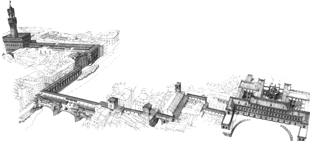 At the time, Florence was transitioning from a republic to a duchy under Cosimo’s rule, and public safety was a concern for the Medici ruler. The corridor enabled him to bypass the bustling streets, avoiding threats while reinforcing his absolute authority over the city.