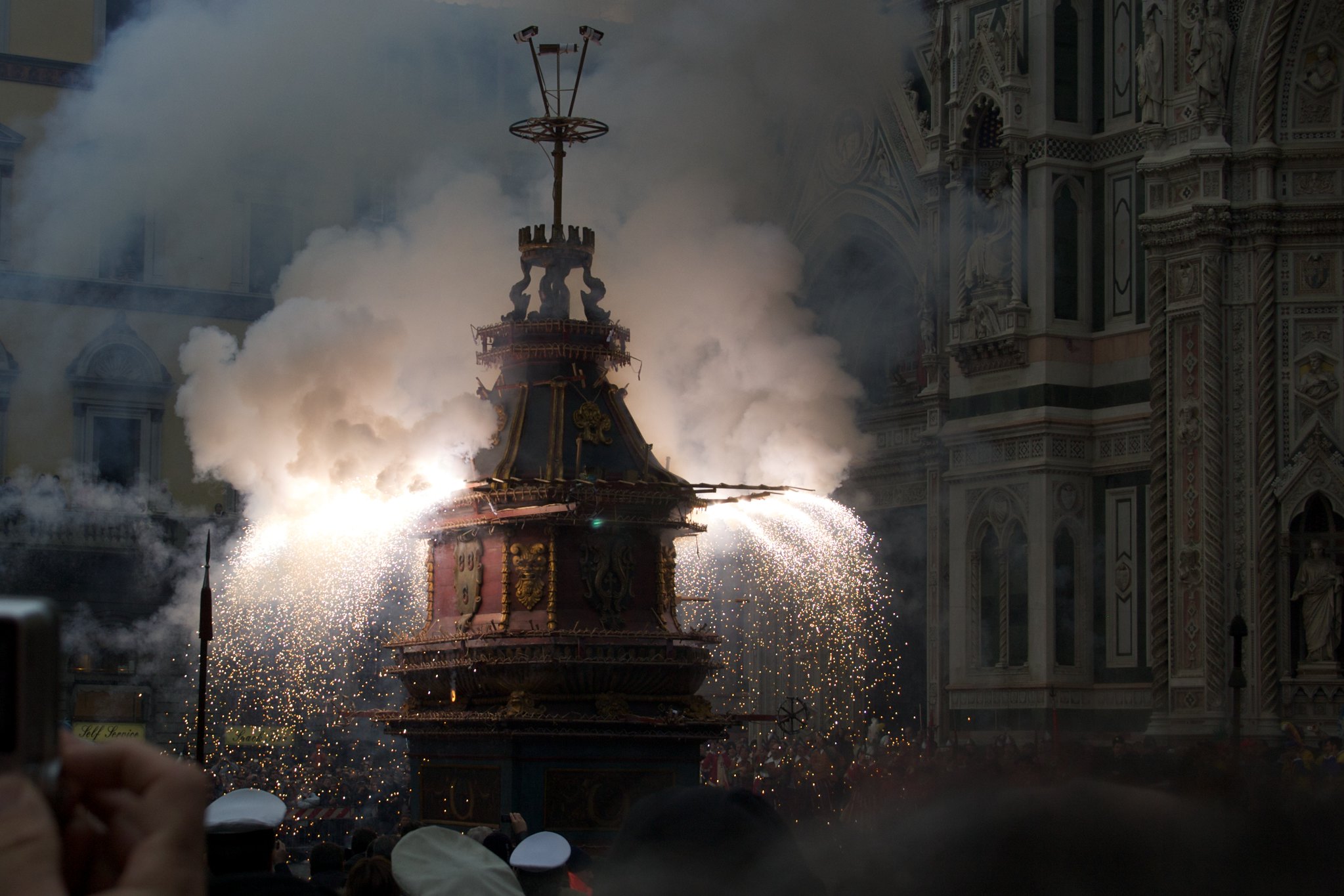 Now, the event takes place at the Piazza del Duomo on Easter Sunday. The 9.1-meter tall, 500-year cart is escorted through town by soldiers, musicians, and townspeople in 15th-century dress.